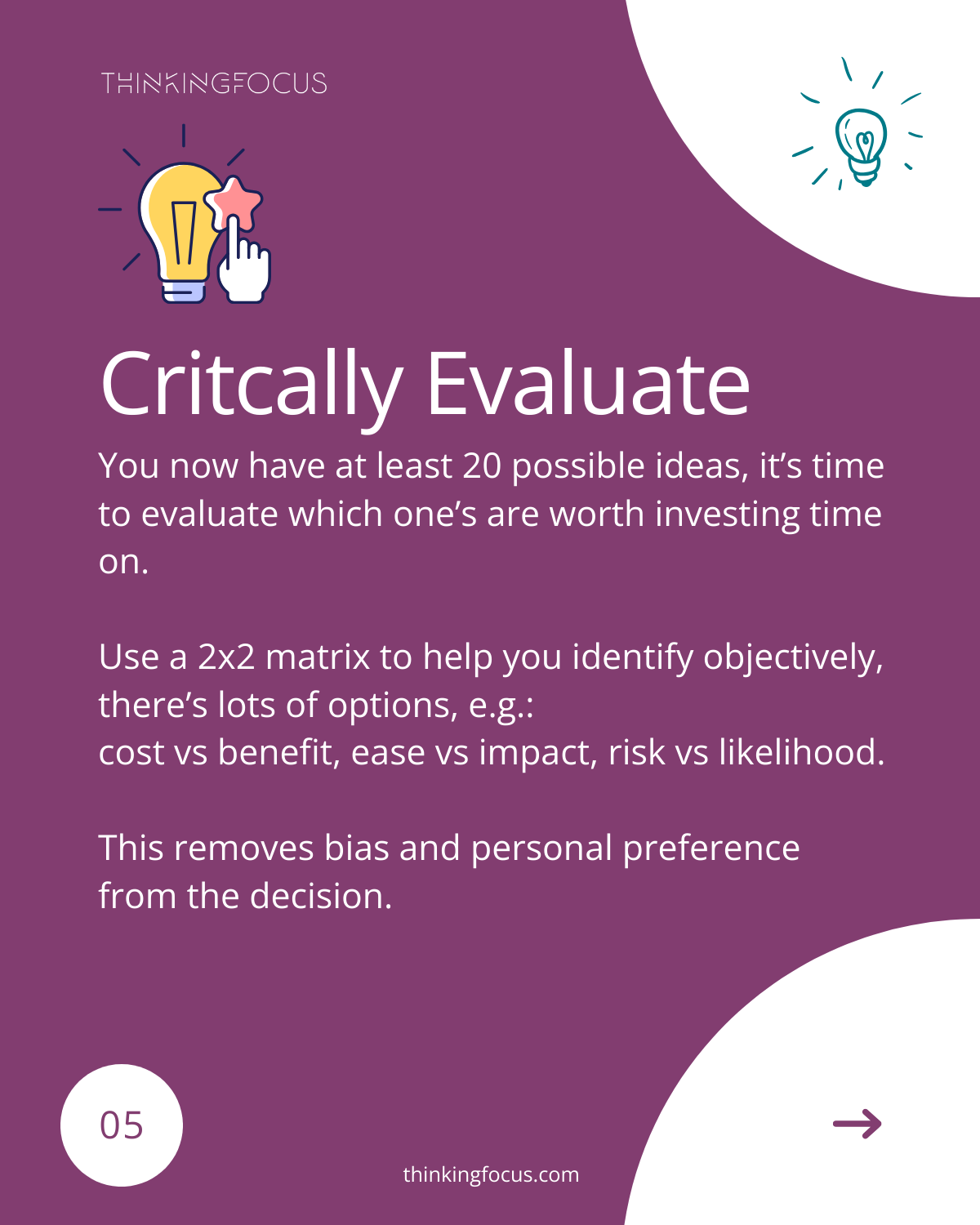 Critical thinking follows creative thinking or task analysis; it helps you to prioritise where to spend your time. They work by eliminating bias, which means you will make more objective decisions rather than relying on your gut or what you like to do.